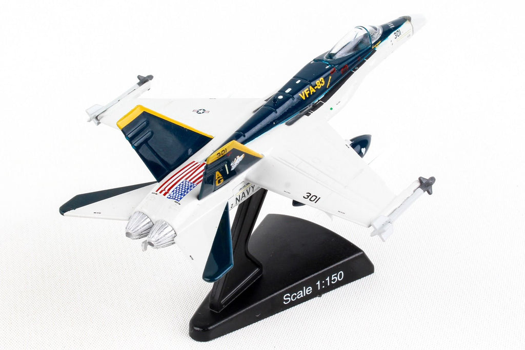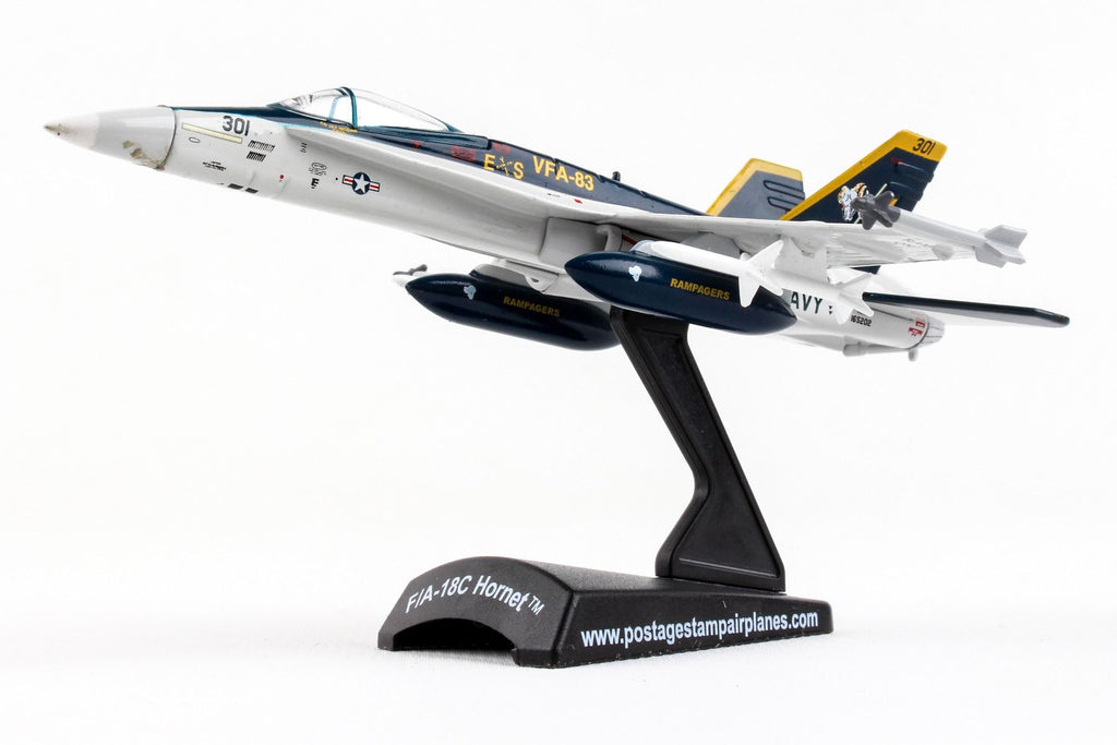 The real Boeing F/A-18C Hornet was developed by McDonnell Douglas and Northrop during the 1970s as a highly capable multirole fighter. With a top speed of Mach 1.8, the Hornet became the first modern jet designed to perform both fighter and attack roles, excelling in missions ranging from fleet defense and air interdiction to close air support and the suppression of enemy defenses. This Postage Stamp 1/150 scale collector model recreates the aircraft flown by Strike Fighter Squadron 83, known as the “Rampagers,” a storied U.S. Navy unit established in the 1950s. VFA-83 operated the F/A-18C from 1987 until its transition to the F/A-18E Super Hornet in 2018. This display model highlights the squadron’s recognizable markings and the legacy of a jet that served across decades of naval aviation.